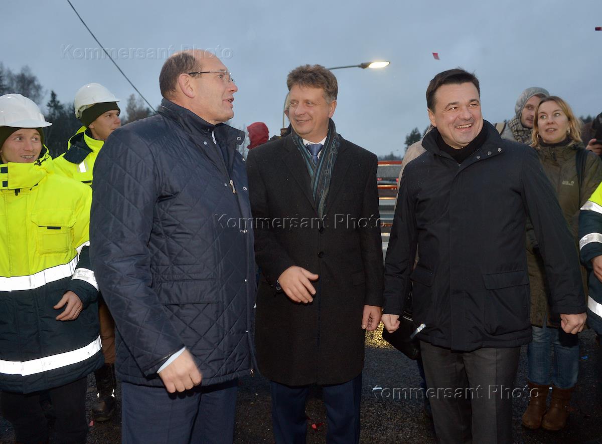 Церемония открытия участка Центральной кольцевой автомобильной дороги (ЦКАД) прошло в района Звенигорода. Слева направо: министр транспорта России Максим Соколов, председатель правления ГК "Автодор" Сергей Кельбах и губернатор Московской области Андрей Воробьев во время церемонии открытия.