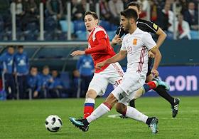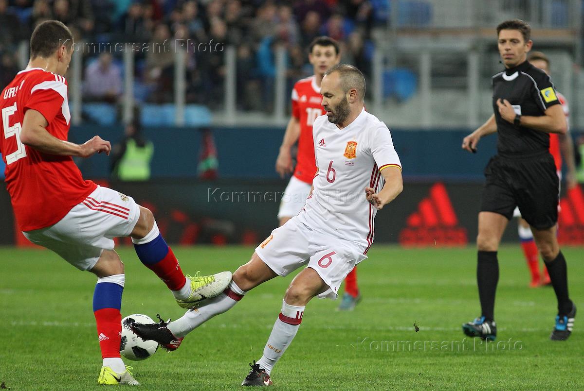 Товарищеский матч по футболу между сборными России и Испании прошел на стадионе "Санкт-Петербург". Игрок сборной России Денис Глушаков (слева) и игрок сборной Испании Тиаго Алькантара (справа) во время матча.