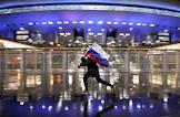 Жанровая фотография. Болельщик с флагом России бежит по площади перед стадионом "Санкт-Петербург Арена".