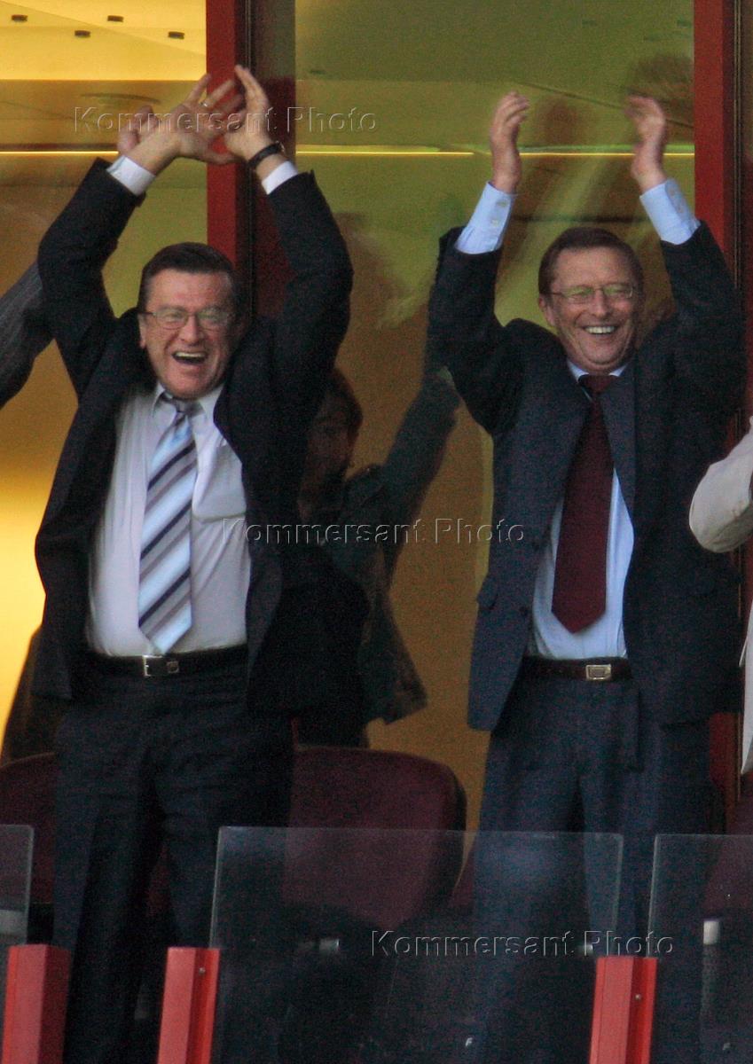 Руководитель Федеральной службы по финансовому мониторингу Виктор Зубков (слева) и министр обороны России Сергей Иванов (справа) на трибуне болельщиков футбольного матча Лиги Чемпионов между командами "ЦСКА" и "Глазго Рейнджерс" (Шотландия). Команда "ЦСКА" выиграла со счетом 2 : 1. Матч прошел на стадионе "Локомотив".
