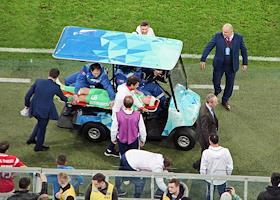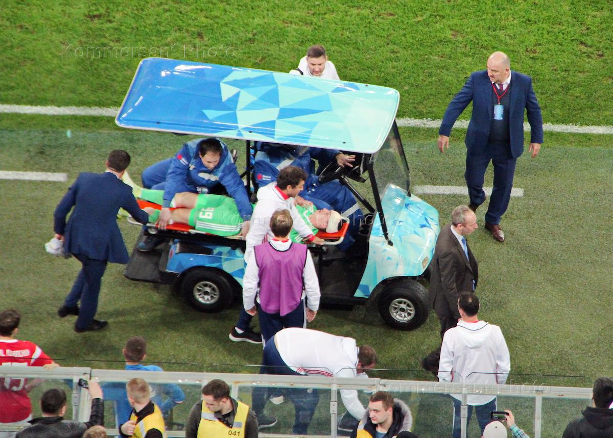 Товарищеский матч по футболумежду сборными России и Испании прошел на стадионе "Санкт-Петербург". Медики оказывают помощь и эвакуируют с поля травмированного вратаря сборной России Андрея Лунева.