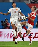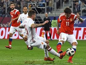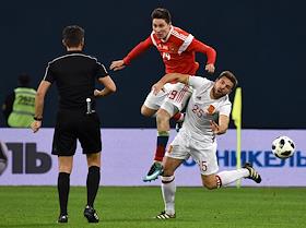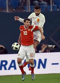 Товарищеский матч по футболу между сборными России и Испании прошел на стадионе "Санкт-Петербург". Игрок сборной России Алан Дзагоев (слева) и ирок сборной Испании Пике Херард (справа) во время матча.