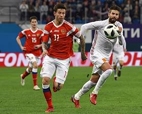Товарищеский матч по футболу между сборными России и Испании прошел на стадионе "Санкт-Петербург". Игрок сборной России Федор Смолов (слева) во время матча.