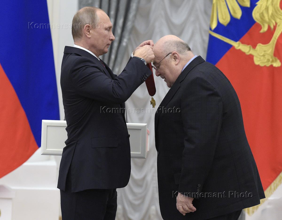 Президент России Владимир Путин (слева) и художественный руководитель Московского театра ET CETERA Александр Калягин (справа) во время церемонии вручения государственных наград деятелям науки, культуры, искусства, образования, космонавтам, рабочим, врачам, руководителям предприятий. Церемония прошла в Кремле.