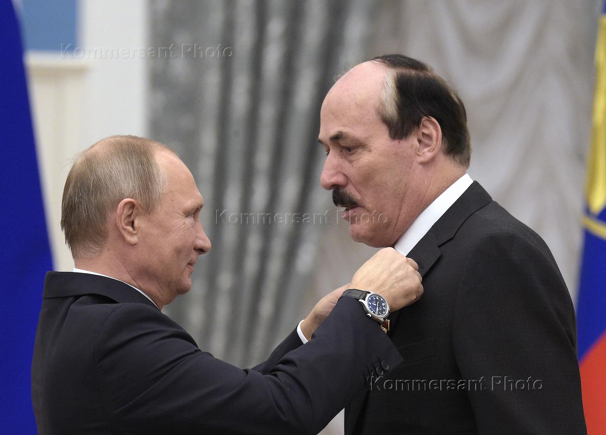 Президент России Влаимир Путин (слева) и специальный представитель президента РФ по вопросам гуманитарного и экономического сотрудничества с государствами Каспийского региона Рамазан Абдулатипов (справа) во время церемонии вручения государственных наград деятелям науки, культуры, искусства, образования, космонавтам, рабочим, врачам, руководителям предприятий. Церемония прошла в Кремле.