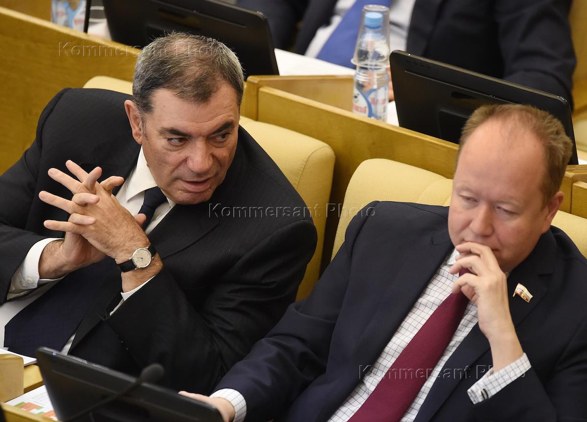 Дополнительное заседание Государственной думы (ГД) России. Члены комитета ГД России по международным делам Мурад Гадыльшин (слева) и Артур Чилингаров (справа) во время заседания.