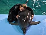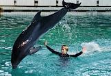 Петербургский дельфинарий. Тренер Юлия Лебедева тренирует дельфина-афалину в бассейне дельфинария.