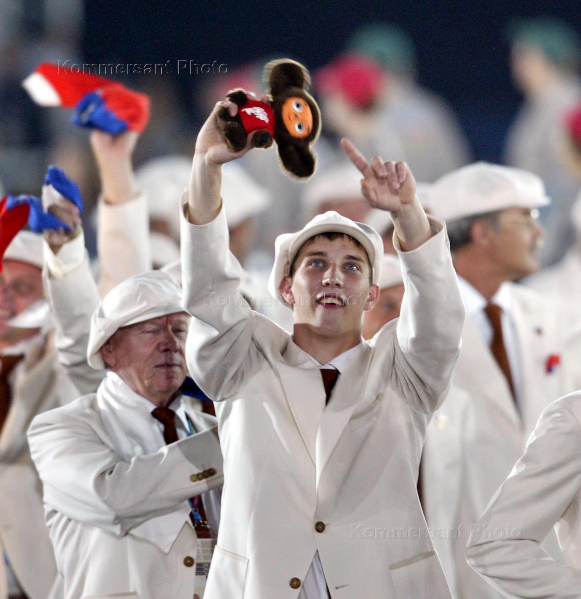 Российская олимпийская сборная во время торжественной церемонии открытия Летних Олимпийских игр 2004 года в Афинах.