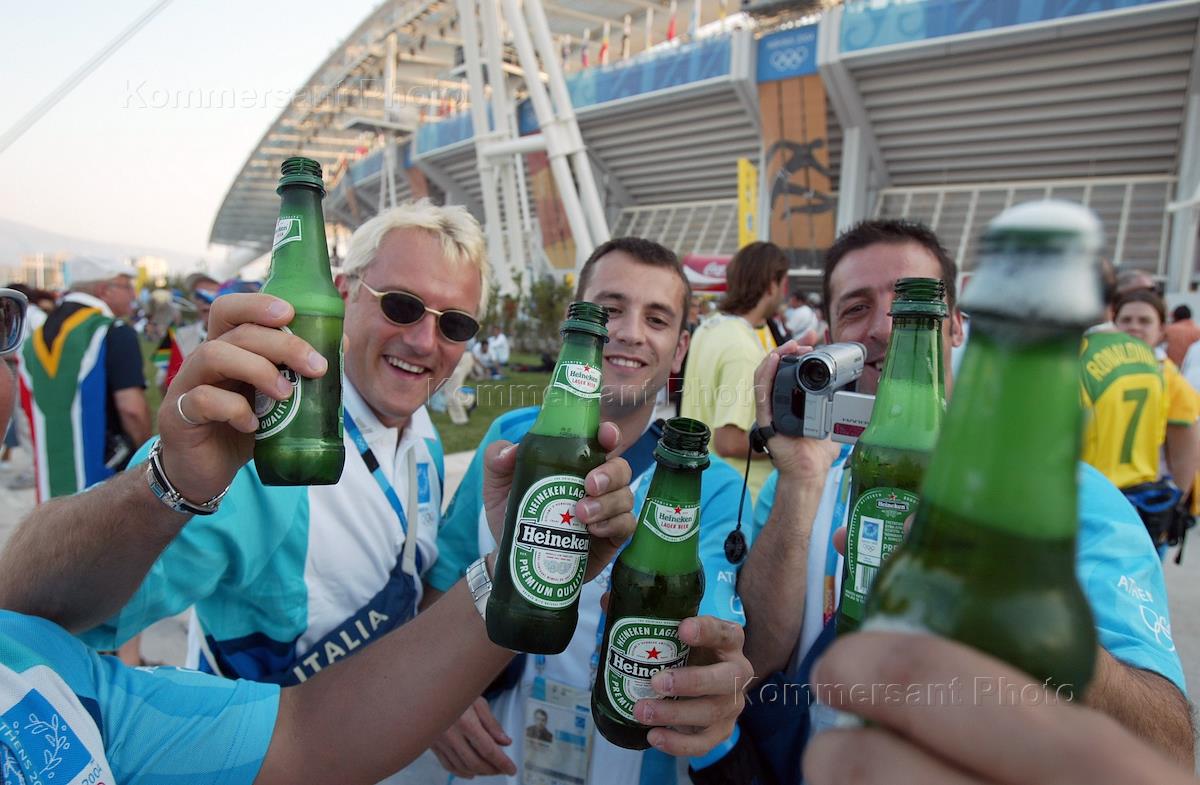 Летние XXVIII Олимпийские игры 2004 года. Итальянский болельщики с бутылками пива Heineken во время соревнований.