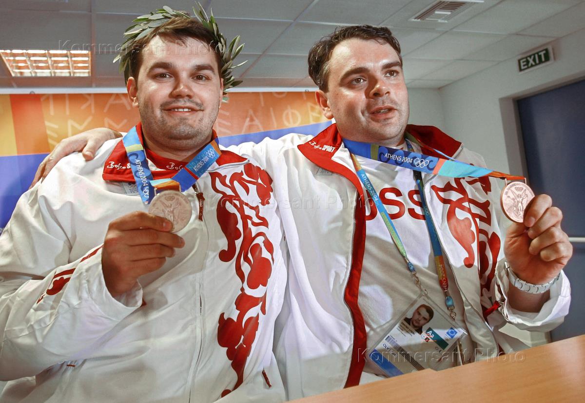 Олимпиада 2004. Участники олимпийской сборной России по стрельбе Александр Блинов (слева) и Дмитрий Лыкин (справа) показывают свои награды после церемонии награждения на XXVIII летней Олимпиаде. Александр Блинов получил серебряную медаль в стрельбе по движущейся мишени из пневматической винтовки на дистанции 10 м , а Дмитрий Лыков бронзовую.