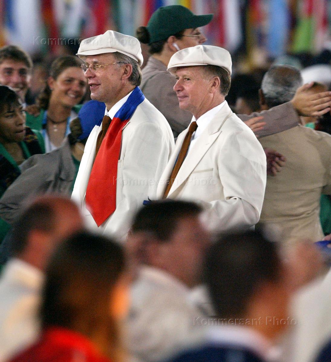 Олимпиада 2004. Председатель Государственного комитета по спорту России Вячеслав Фетисов (слева) и президент Олимпийского комитета России Леонид Тягачев (справа) на торжественной церемонии открытия Олимпийских игр на стадионе в Афинах.
