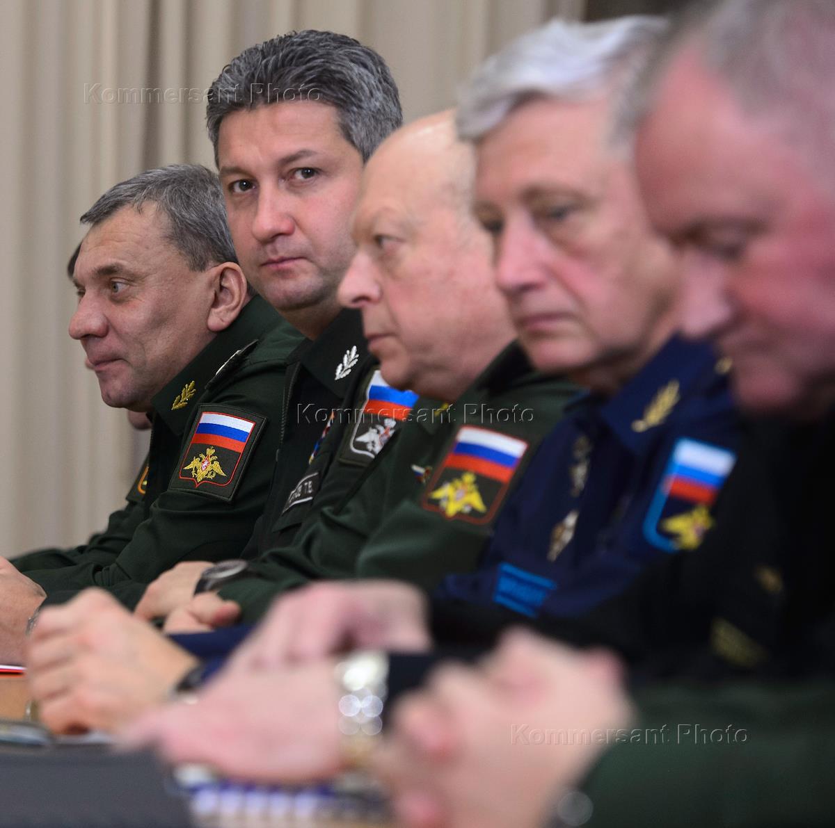 Рабочая поездка президента России Владимира Путина в Сочи. Главнокомандующий сухопутными войсками России Олег Салюков (в центре) во время совещания президента России Владимира Путина с руководителями Министерства обороны России и представителями предприятий Оборонно-промышленного комплекса (ОПК) в резиденции "Бочаров ручей".