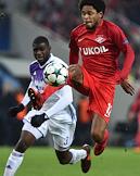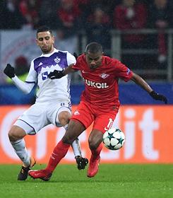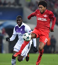 Лига чемпионов УЕФА сезона -2017/2018. Групповой этап. Матч между командами "Спартак" (Москва, Россия) - "Марибор" (Марибор, Словения) прошел на стадионе "Открытие Арена". Игрок команды "Спартак" Луис Адриано (справа) во время матча.