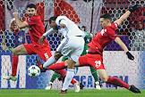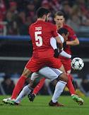 Лига чемпионов УЕФА сезона -2017/2018. Групповой этап. Матч между командами "Спартак" (Москва, Россия) - "Марибор" (Марибор, Словения) прошел на стадионе "Открытие Арена". Игроки команды "Спартак" Сердар Таски (слева) Илья Кутепов (справа) и игрок команды "Марибор" Маркос Таварес (в центре) во время игры.