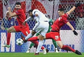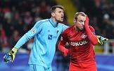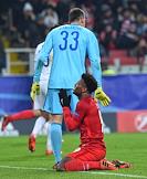 Лига чемпионов УЕФА сезона -2017/2018. Групповой этап. Матч между командами "Спартак" (Москва, Россия) - "Марибор" (Марибор, Словения) прошел на стадионе "Открытие Арена". Игрок команды "Спартак" Зе Луиш (справа) и вратарь команды "Марибор" Ясмин Ханданович (слева) во время игры.