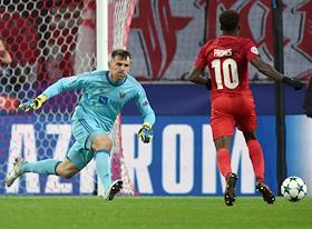 Лига чемпионов УЕФА сезона 2017/2018. Групповой этап. Матч между командами "Спартак" (Москва, Россия) и "Марибор" (Марибор, Словения) прошел на стадионе "Открытие Арена". Игрок команды "Спартак" Квинси Промес (справа) и вратарь команды "Марибор" Самир Ханданович (слева) во время матча.