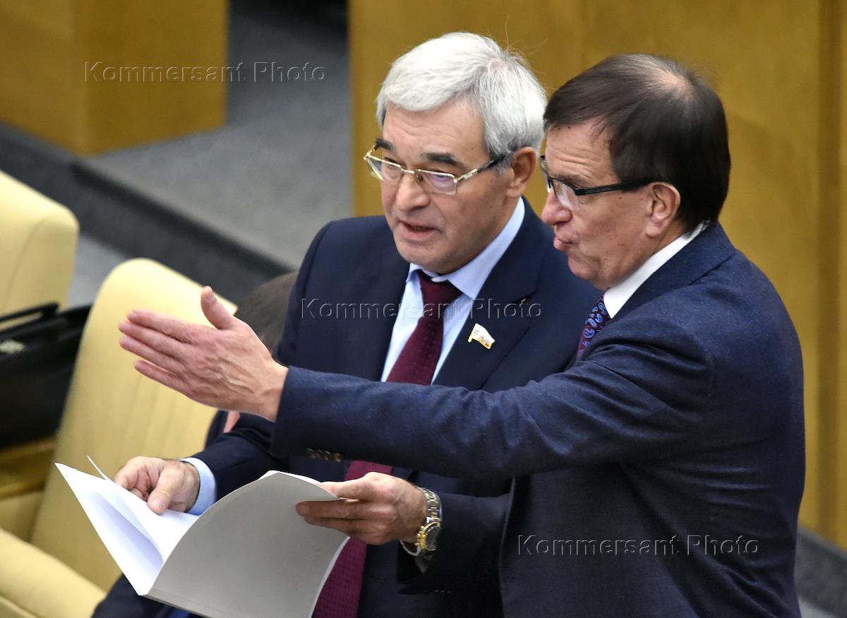 Дополнительное заседание Государственной думы (ГД) России. Член комитета ГД России по энергетике Александр Карелин (слева) и член комитета ГД России по труду, социальной политике и делам ветеранов Владимир Мельник (справа) во время заседания.