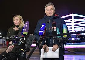 Церемония открытия катка в Парке культуры и отдыха имени Горького (ЦПКиО). Директор ЦПКиО Марина Люльчук (слева) и руководитель департамента культуры города Москвы Александр Кибовский (справа) во время церемонии.