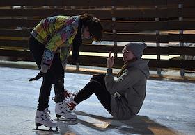 Церемония открытия катка в Парке культуры и отдыха имени Горького (ЦПКиО). Посетители в пункте проката коньков перед началом церемонии.