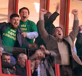 Начальник Службы безопасности президента Чечни Рамзан Кадыров (вверху), генерал-полковник Геннадий Трошев (справа) и кандидат на пост президента Чеченской Республики, министр внутренних дел республики Алу Алханов (внизу) на трибуне болельщиков во время первого отборочного матча кубка УЕФА между командами "Терек" (Грозный) и "Лех" (Польша). Матч прошел на стадионе "Локомотив".