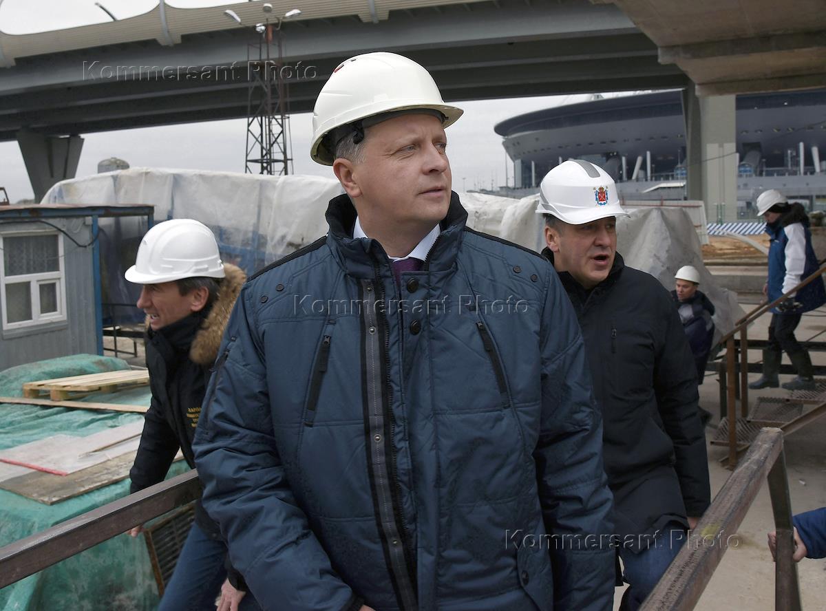 Министр транспорта России Максим Соколов во время посещения проблемной стройки станции метро "Беговая" в Санкт-Петербурге.