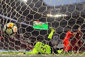 Чемпионат России по футболу 2017/2018. 18-й тур. Матч между командами "Рубин" (Казань) и ЦСКА (Москва) прошел на стадионе "Казань Арена". Вратарь команды "Рубин" Сослан Джанаев (в центре) во время матча.