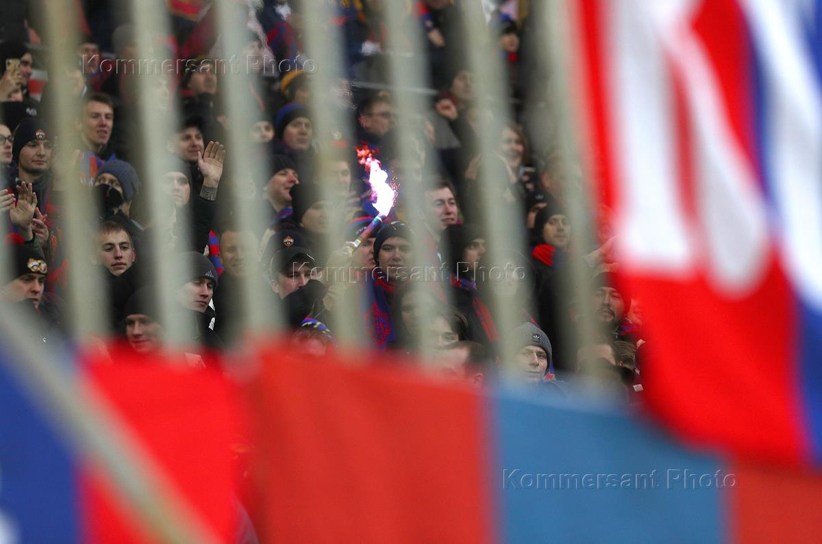 РОСГОССТРАХ Чемпионат России по футболу 2017/2018. 18-й тур. Матч между командами "Рубин" (Казань) и ЦСКА (Москва) прошел на стадионе "Казань Арена". Болельщики команды ЦСКА на трибуне во время матча.