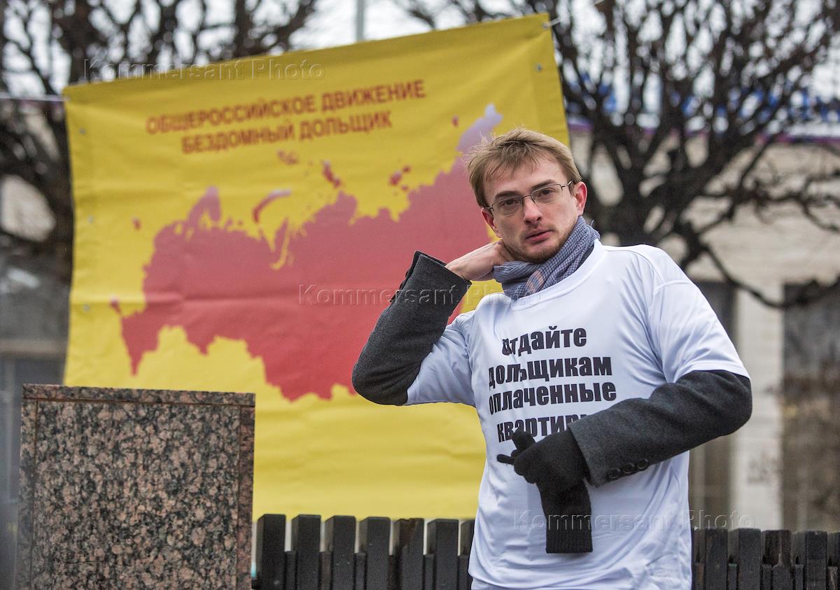 Митинг общероссийского движения "Бездомный дольщик" прошел на площади Ленина. Участники с плакатом во время митинга.
