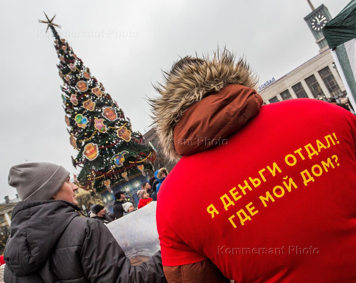 Митинг общероссийского движения "Бездомный дольщик" прошел на площади Ленина. Участники с плакатом во время митинга.