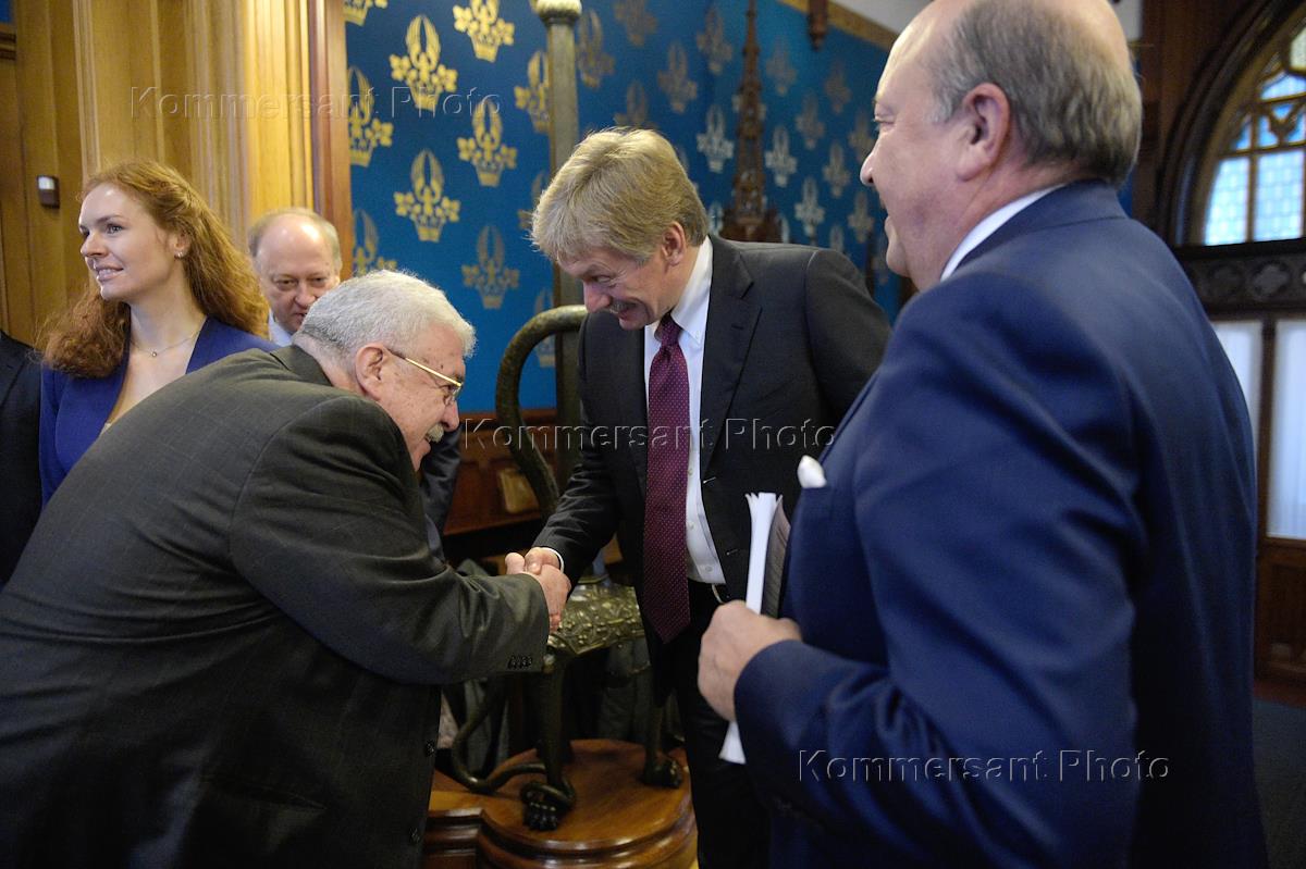 Общее собрание Российского совета по международным делам (РСМД) прошло в Доме приемов МИД России. Слева направо: первый заместитель генерального директора ИТАР-ТАСС Михаил Гусман, заместитель руководителя администрации президента России, пресс-секретарь президента Дмитрий Песков и президент Российского совета по международным делам Игорь Иванов перед началом собрания.