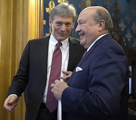 Общее собрание Российского совета по международным делам (РСМД) прошло в Доме приемов МИД России. Президент Российского совета по международным делам Игорь Иванов (справа) и заместитель руководителя администрации президента России, пресс-секретарь президента Дмитрий Песков (слева) перед началом собрания.