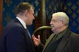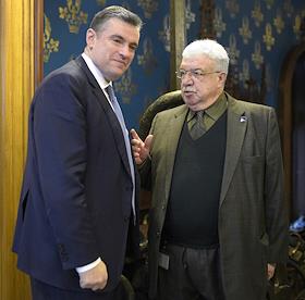 Общее собрание Российского совета по международным делам (РСМД) прошло в Доме приемов МИД России. Первый заместитель генерального директора ИТАР-ТАСС Михаил Гусман (справа) и председатель комитета Государственной думы России по международным делам Леонид Слуцкий (слева) перед началом собрания.