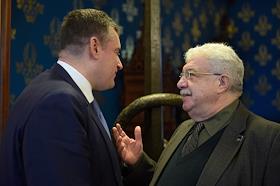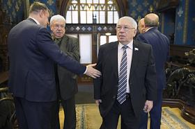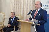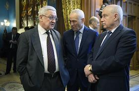 Общее собрание Российского совета по международным делам (РСМД) в Доме Приемов МИД России. Государственный секретарь Союзного государства России и Белоруссии Григорий Рапота (в центре) и председатель исполнительного комитета - исполнительный секретарь Содружества Независимых Государств (СНГ) Cергей Лебедев (справа) перед началом собрания.