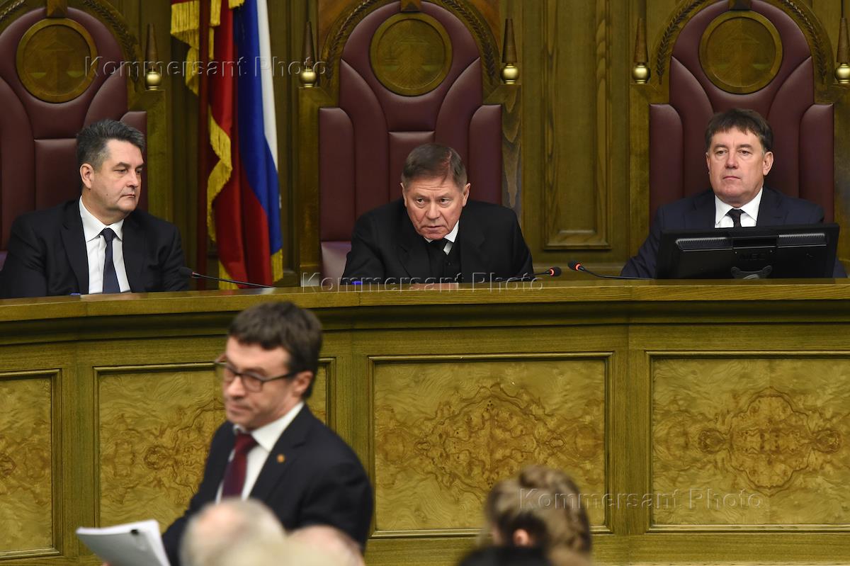 Заседание пленума Верховного суда России. Председатель Верховного суда России Вячеслав Лебедев (в центре) и заместитель генерального прокурора России Николай Винниченко (слева) и председатель Совета судей России Виктор Момотов (справа) во время заседания.