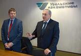 Пресс-тур от компании Siemens на завод "Уральские локомотивы". Генеральный директор ООО "Уральские локомотивы" Александр Салтаев (справа) и директор департамента "Мобильность" компании Siemens в России Йорг Либшер (слева) во время пресс-конференции.