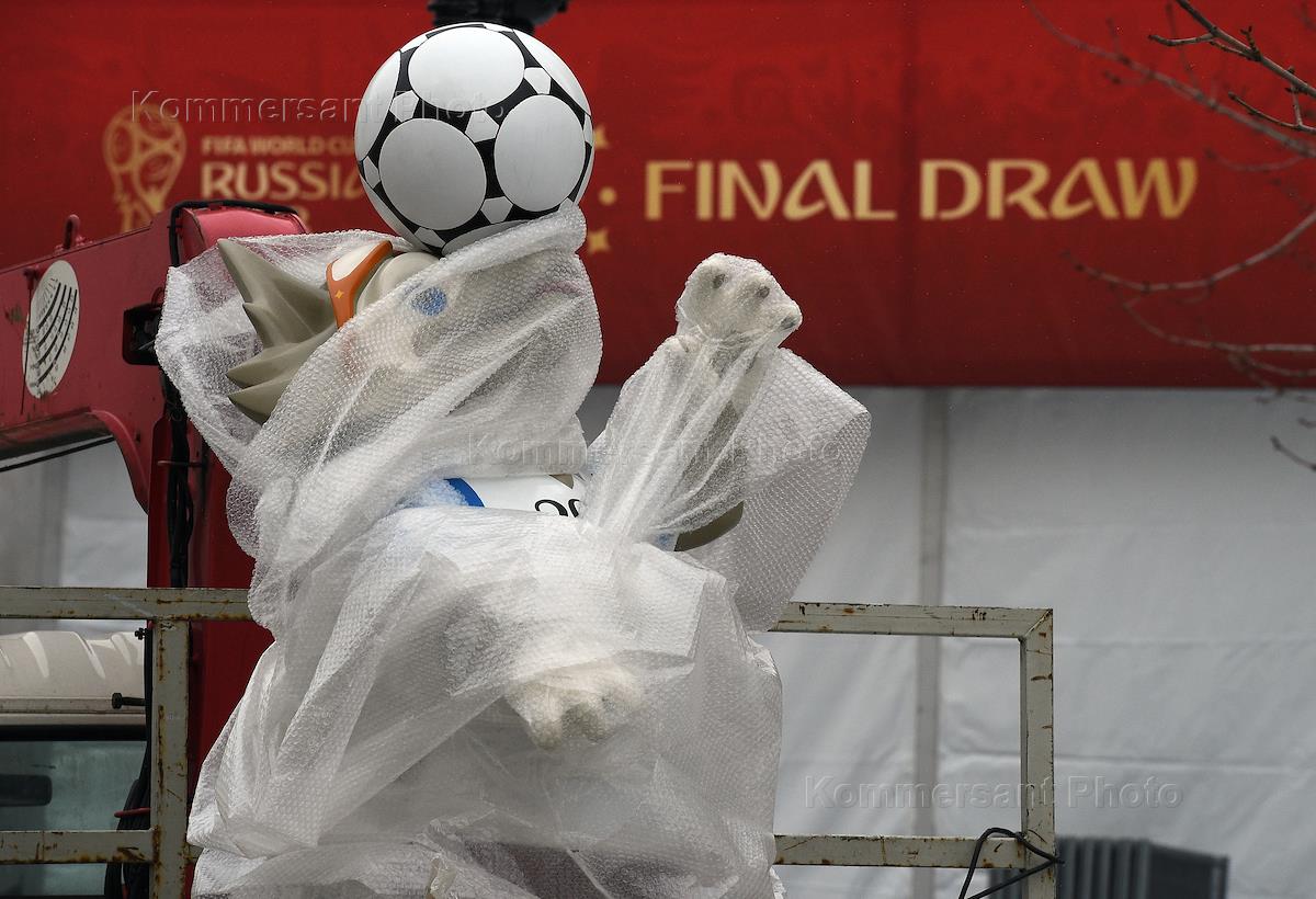 Подготовка к церемони Финальной жеребьевки Чемпионата мира по футболу FIFA 2018 в Государственном Кремлевском дворце. Символ - волк Забивака.