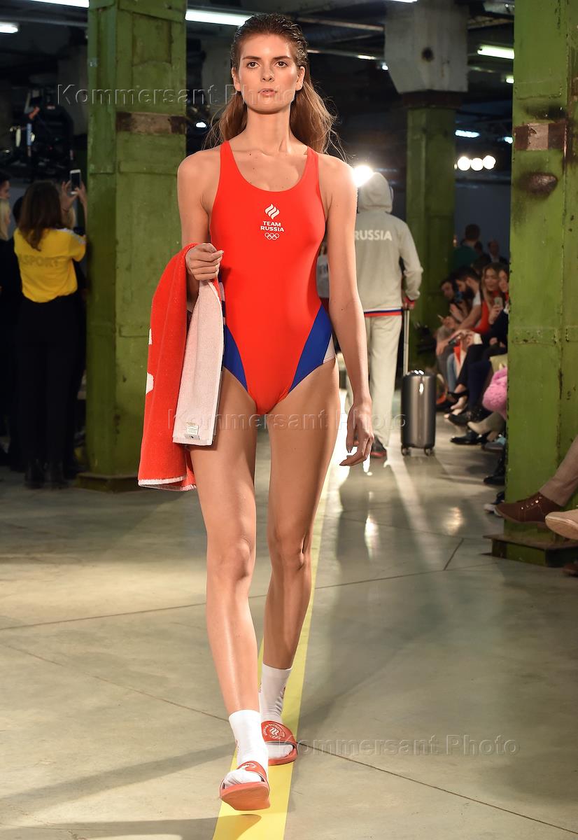 Премьерный показ экипировки Олимпийской команды России и casual-коллекции бренда ZASPORT прошел в выставочном зале "Надежда". Волейболистка Екатерина Гамова во время показа.