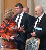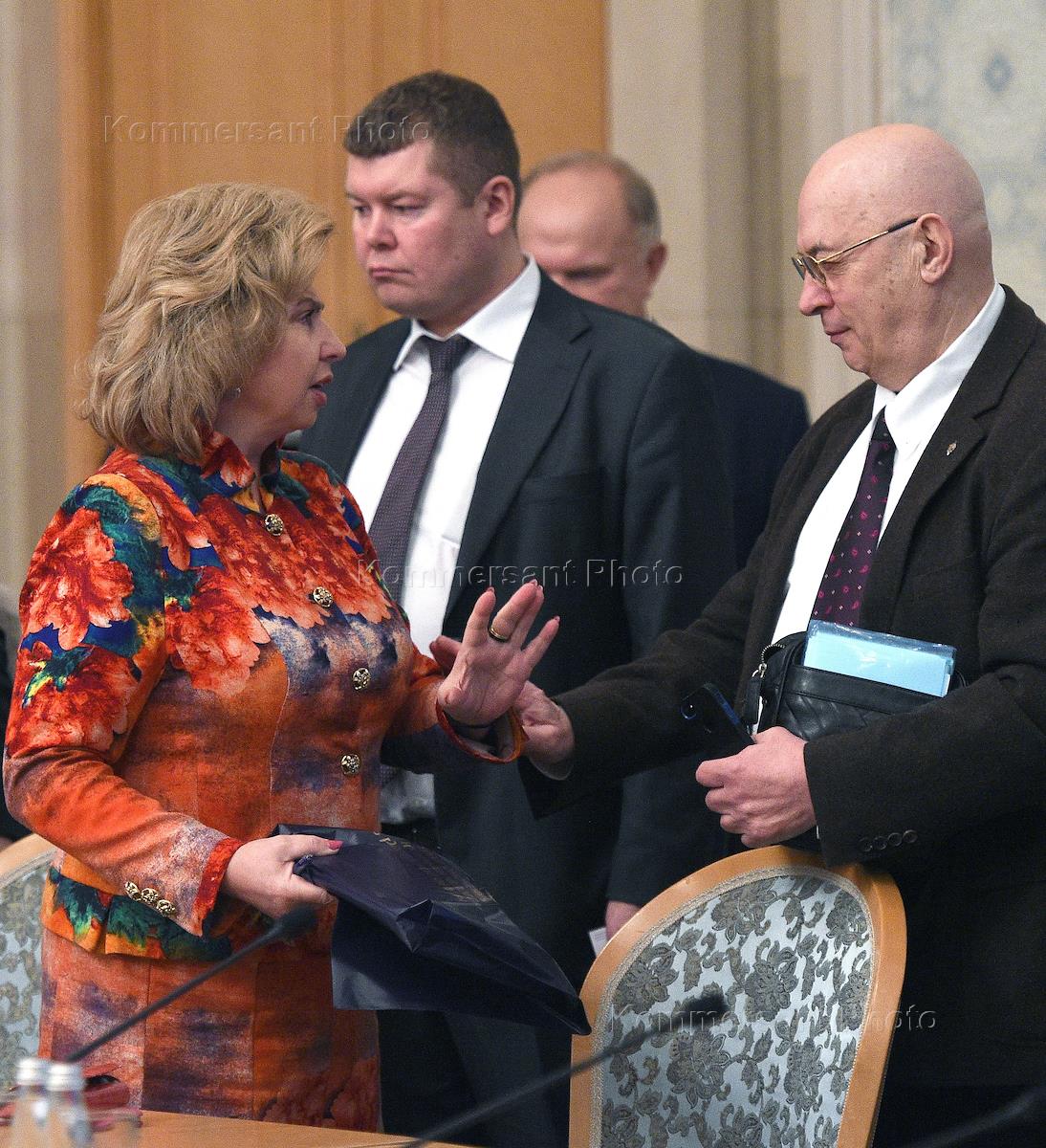 Международная научно-практическая конференцию "Проблемы защиты человека в евразийском пространстве: обмен лучшими практиками омбудсменов" прошла в гостинице "Президент-Отель". Уполномоченный по правам человека в городе Москве Татьяна Потяева (слева) и лидер Коммунистической партии России (КПРФ), член комитета Государственной думы России по делам Содружества Независимых Государств, евразийской интеграции и связям с соотечественниками Геннадий Зюганов (справа) во время конференции.