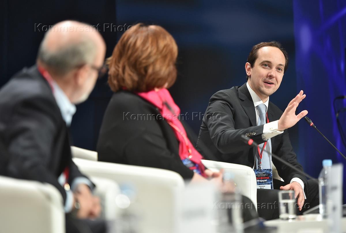 Первый благотворительный социально-инвестиционный форум "Русфонд" в Центре международной торговли (ЦМТ). Слева направо: директор фонда Charities Aid Foundation (CAF) Россия Мария Черток, начальник управления по корпоративной социальной ответственности и бренду компании "Северсталь" Наталья Поппель и президент Русфонда Лев Амбиндер во время форума.