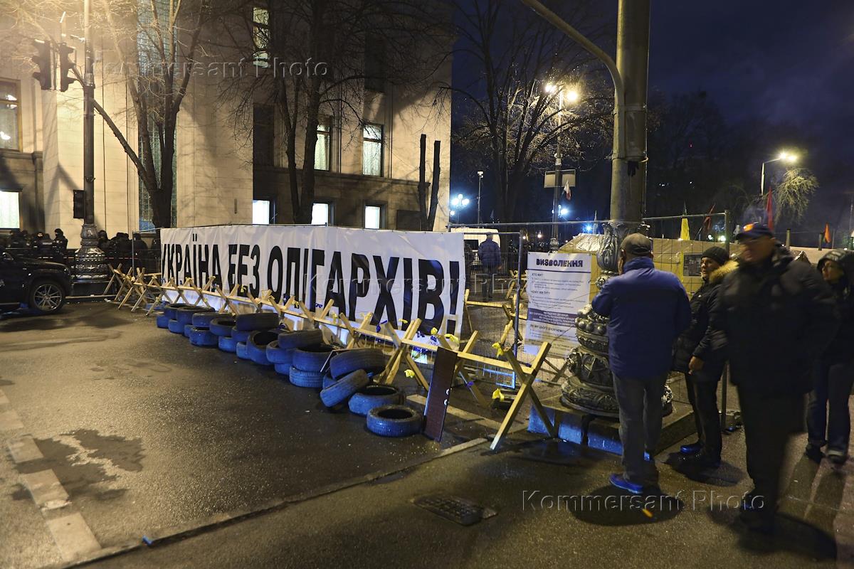 Clashes between law enforcement agencies of Ukraine and supporters of the former governor of Odessa region of Ukraine Mikhail Saakashvili, after his detention. A poster with the sign "Ukraine without oligarchs!".