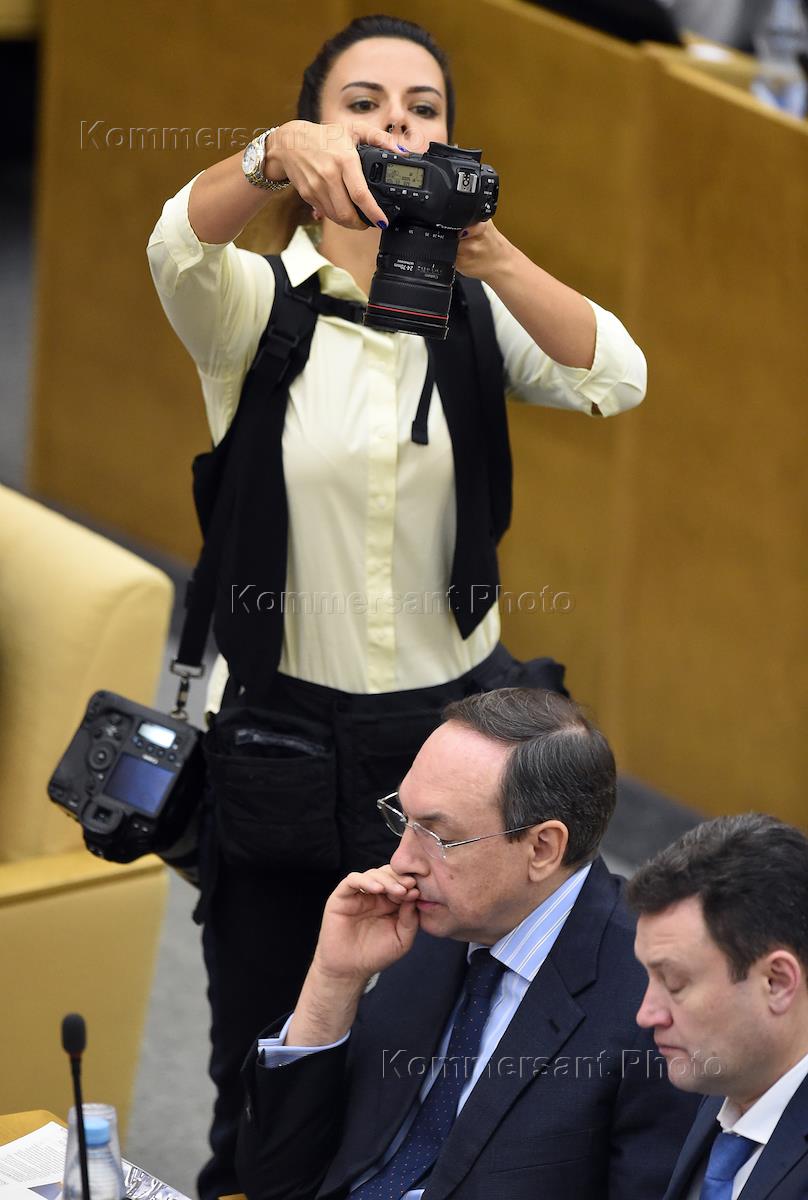 Пленарное заседание Государоственной думы (ГД) России. Заместитель председателя комитета ГД России по международным делам Анатолий Карпов (слева) и член комитета ГД России по вопросам семьи, женщин и детей Инга Юмашева (справа) во время заседания.