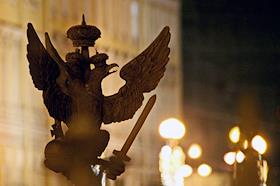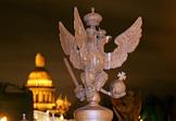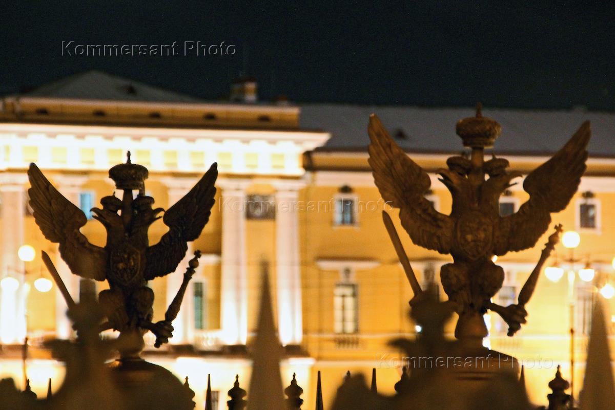 Виды Санкт-Петербурга. Дворцовая площадь вечером. Двуглавые орлы на ограде Александровской колонны.
