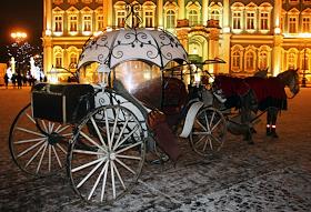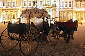 Виды Санкт-Петербурга. Дворцовая площадь вечером. Прогулочная карета для туристов перед Зимним дворцом.