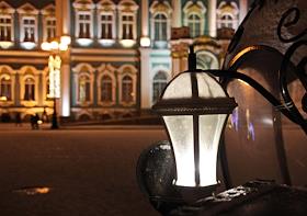 Виды Санкт-Петербурга. Дворцовая площадь вечером. Фонарь прогулочнаой кареты для туристов перед Зимним дворцом.