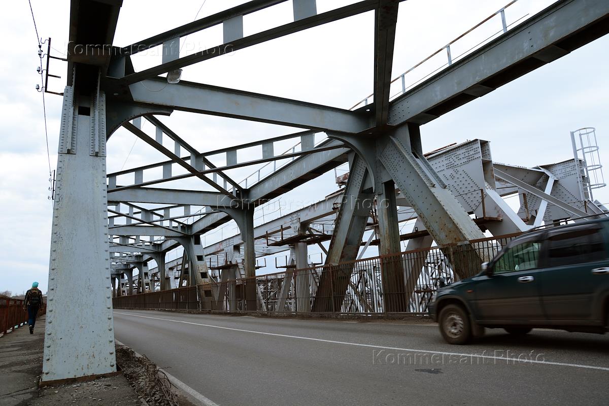 Виды Барнаула. Мост через реку Обь. Автомобильное движение по мосту.
