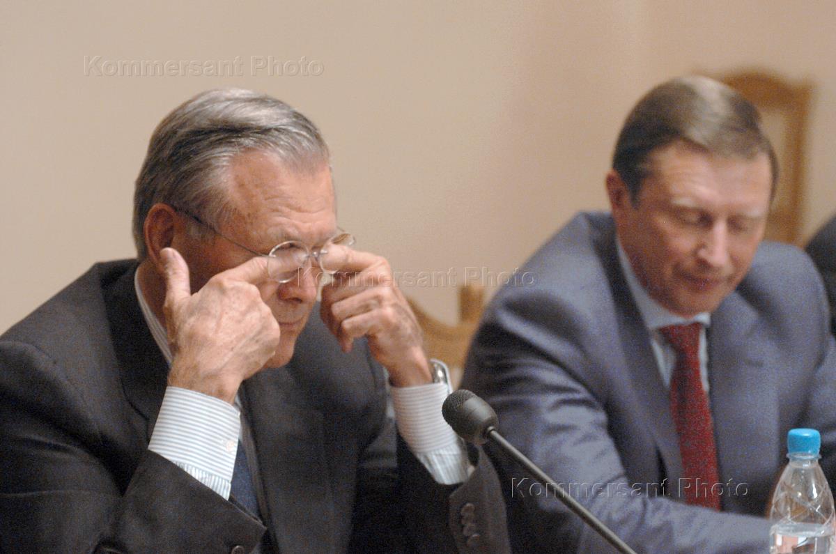 Russian Defense Minister Sergey Ivanov (to the right) and USA Defense Minister Donald Ramsfeld (left) take part in the press conference.