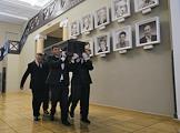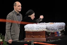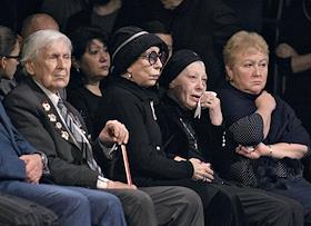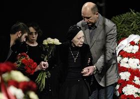 Церемония прощание с актером Леонидом Броневым прошла в Московском театре "Ленком". Актеры Николай Дупак (слева), Инна Чурикова (в центре) и вдова Леонида Броневого Виктория (вторая справа) во время церемонии прощания.