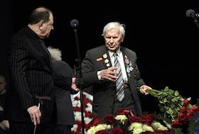 Церемония прощание с актером Леонидом Броневым прошла в Московском театре "Ленком". Директор Московского театра "Ленком" Марк Варшавер (слева) и актер Николай Дупак (справа) во время церемонии прощания.