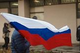 Жанровая фотография. Мужчина несет государственный флаг России.
