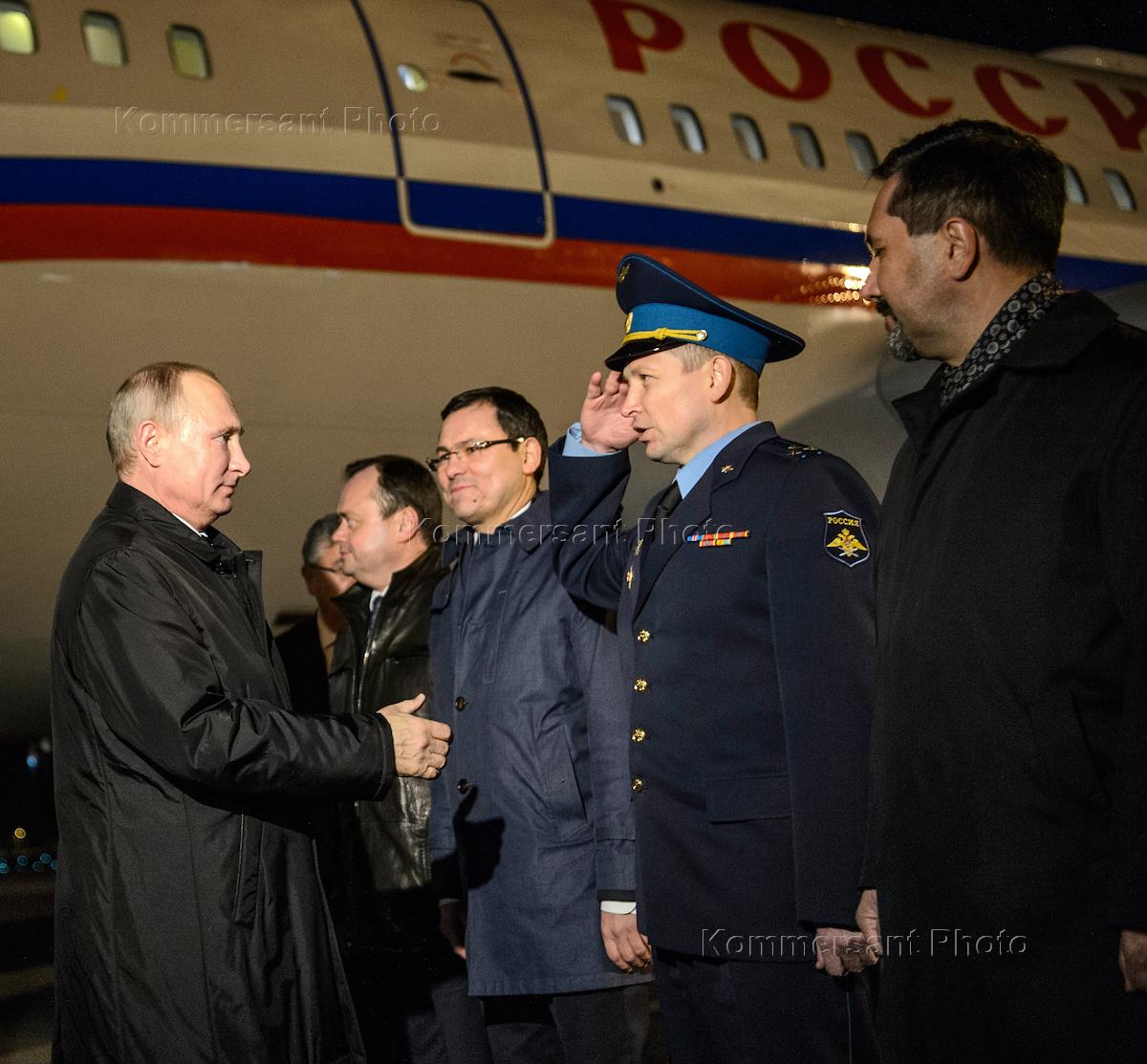 Рабочая поездка президента России Владимира Путина в Турцию. Президент России Владимир Путин (слева) во время встречи в аэропорту.